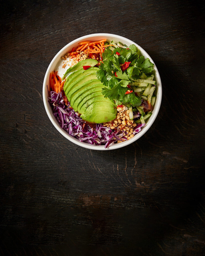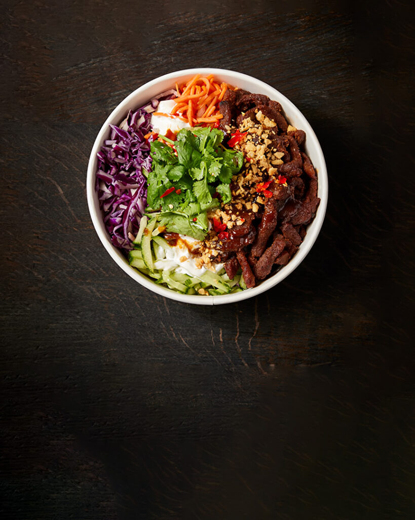 RIS, RØDKÅL, AGURK, DO CHUA, KORIANDER, FRISK CHILI, SOYA, INGEFÆR-CREME, HOISIN-PEANUT-DIP & PEANUT CRUMBLE